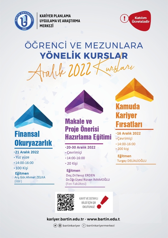Üniversitemiz, öğrencilerinin ve mezunlarının gelişimlerine katkı sağlamak amacıyla aralık ayı içersinde ücretsiz kurslar düzenleyecektir. Kayıt ve bilgi için görseldeki karekodu okutabilir veya buraya tıklayabilirsiniz.