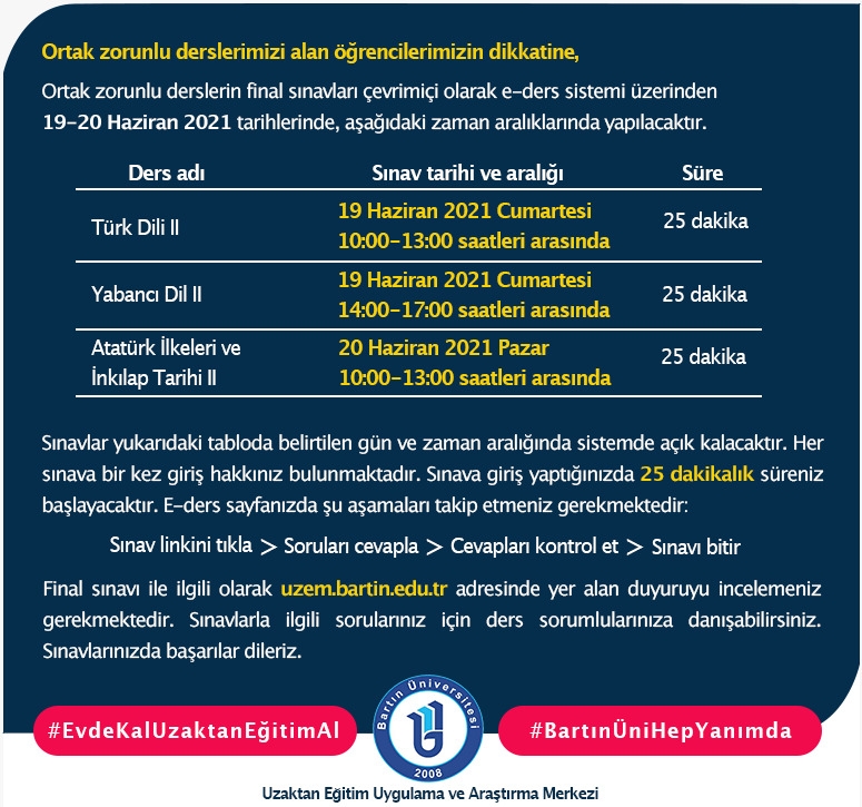 Ortak zorunlu derslerin sınav programı ekte sunulmuştur.