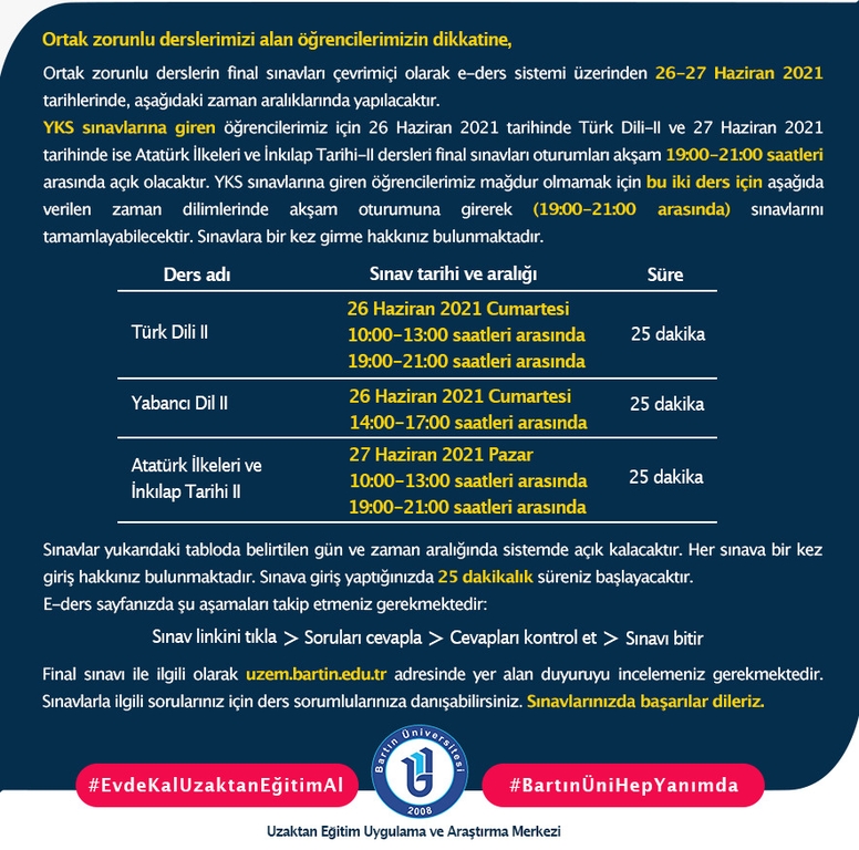Ortak zorunlu derslerin final sınavları YKS tarihlerine denk geldiğinden ek oturumlar belirlenmiştir. İlgili duyuru ve afişe aşağıdan ulaşabilirsiniz.