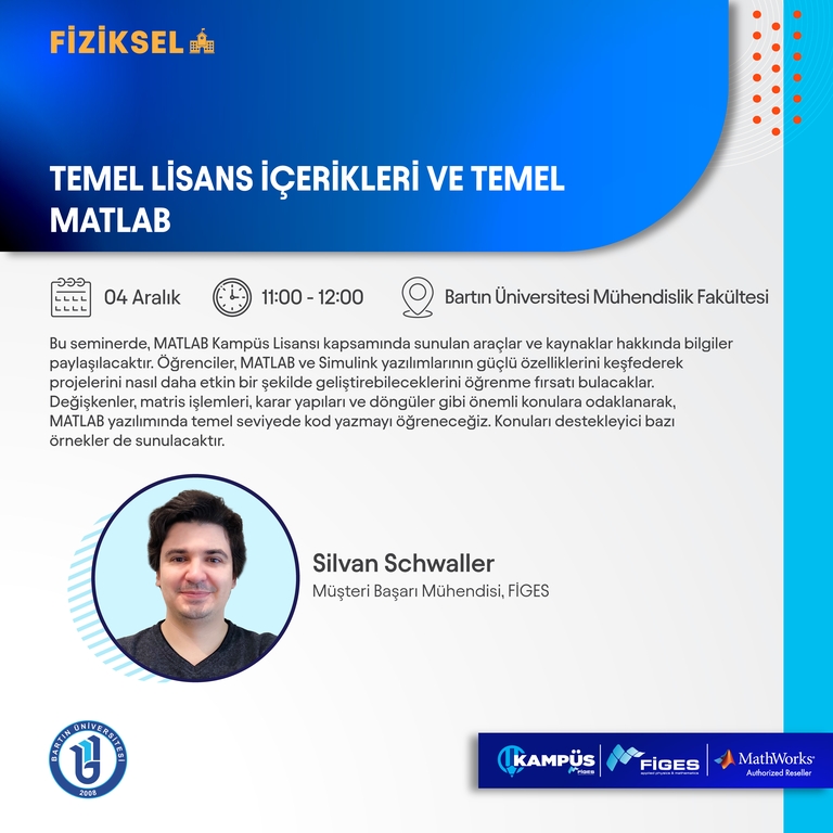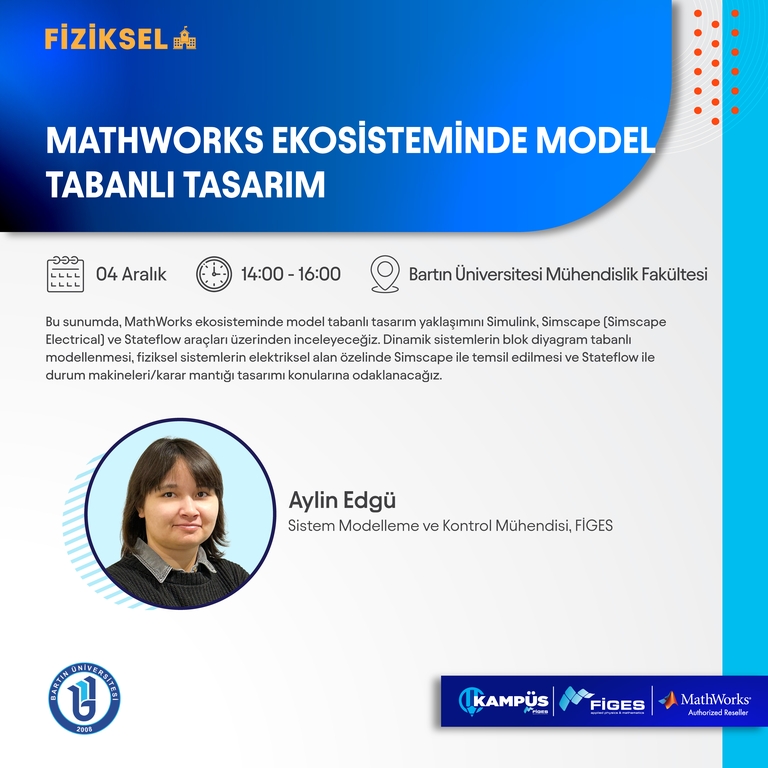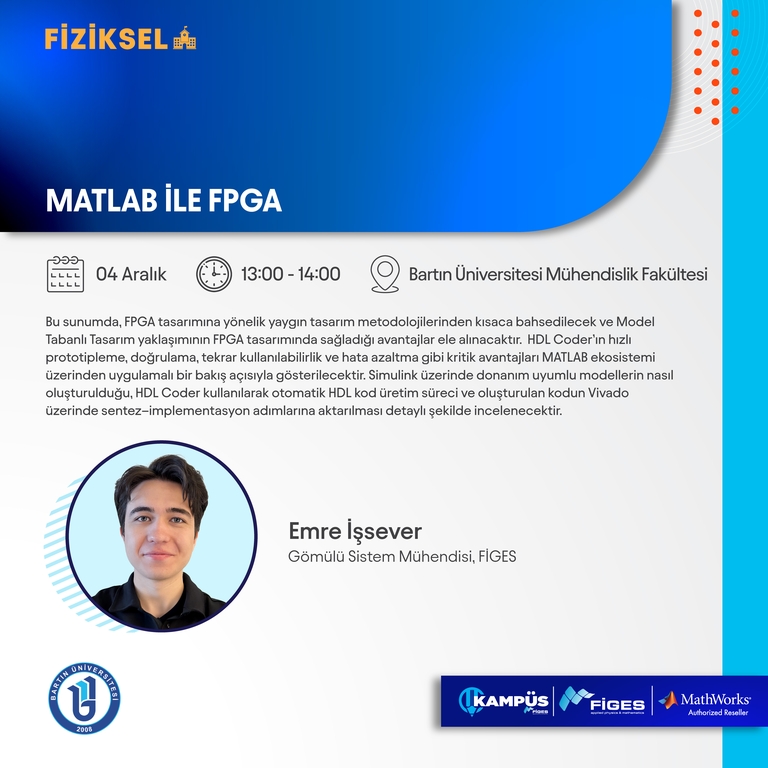 Bartın Üniversitesi Elektrik-Elektronik Mühendisliği Bölümü, FİGES ve MathWorks iş birliğiyle 4 Aralık 2025 tarihinde MATLAB, Simulink, FPGA tasarımı ve model tabanlı tasarım konularında eğitim seminerleri düzenlenecektir. Tüm öğrencilerimiz ve akademik personelimiz etkinliklere davetlidir.